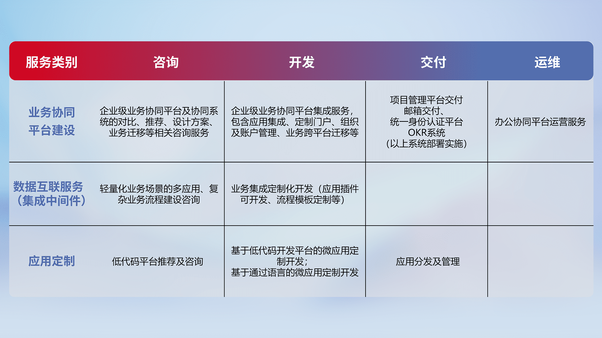 针对钉钉、、、企微、、、IDaas等平台级产品提供产品的规划、、方案、、、、交付、、、、定制化开发等服务,,,,实现如统一协同办公、、、、智能客户服务、、混合会议管理、、、智能数据查询、、等业务场景,,实现数字化转型。。