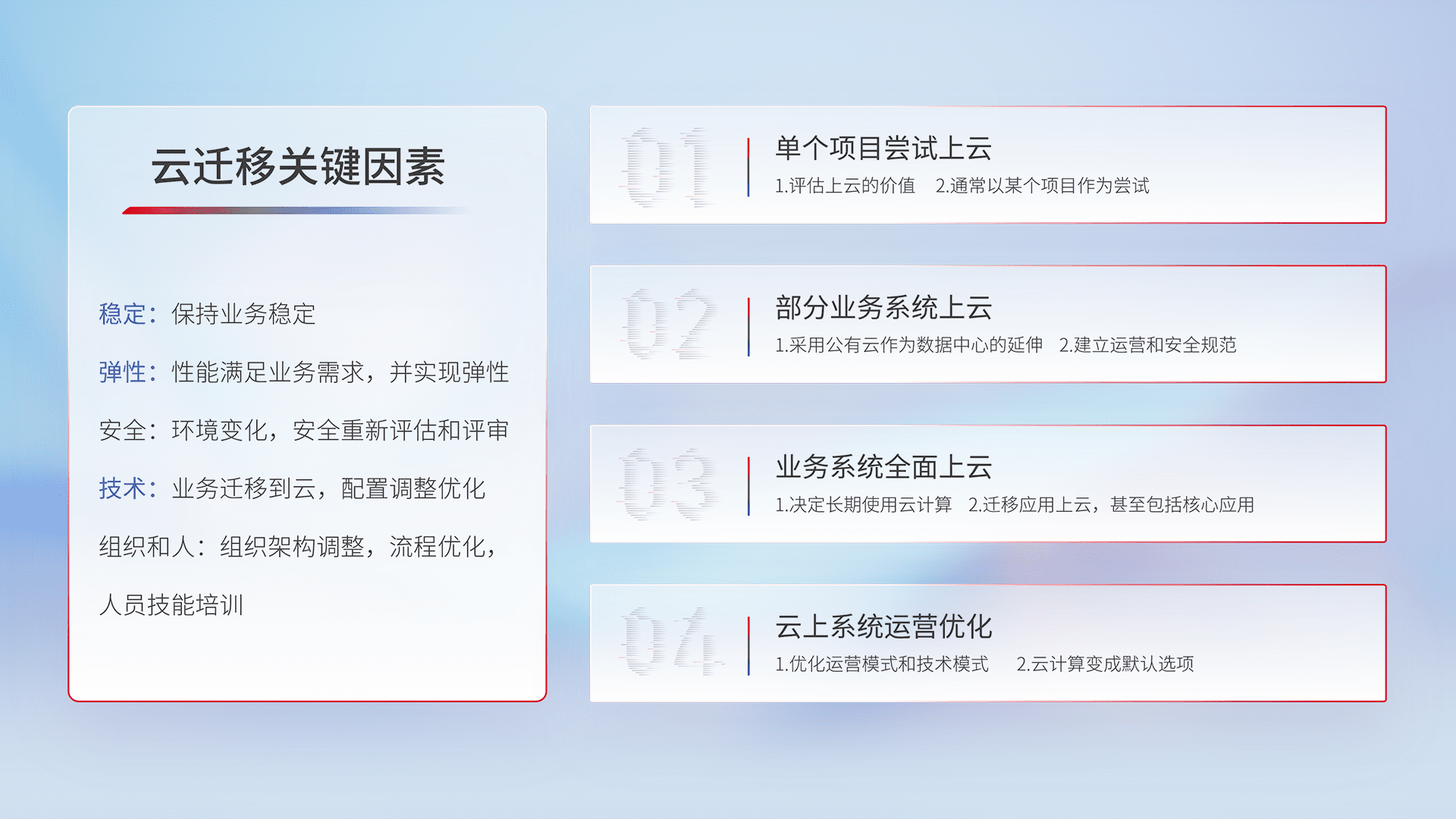 结合实际业务,,从规划设计、、、、云平台选型、、、、云原生改造、、、、数据迁移、、集成交付,,迁移全过程为客户识别最佳上云路径,,做好风险识别管理,,,设计网络架构、、、、身份权限、、安全审计合规、、、操作审计、、、日志审计、、、监控告警策略、、、多站点容灾设计等,,,对云上基础设施进行整体规划,,提升IT治理水平,,,,以满足弹性、、高可用、、、高性能的需求。。