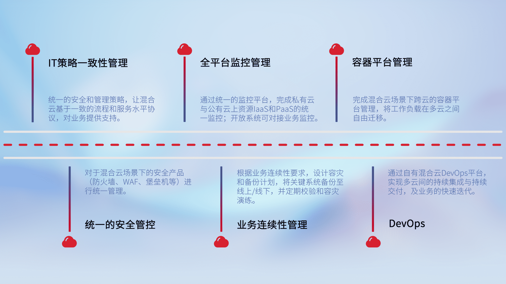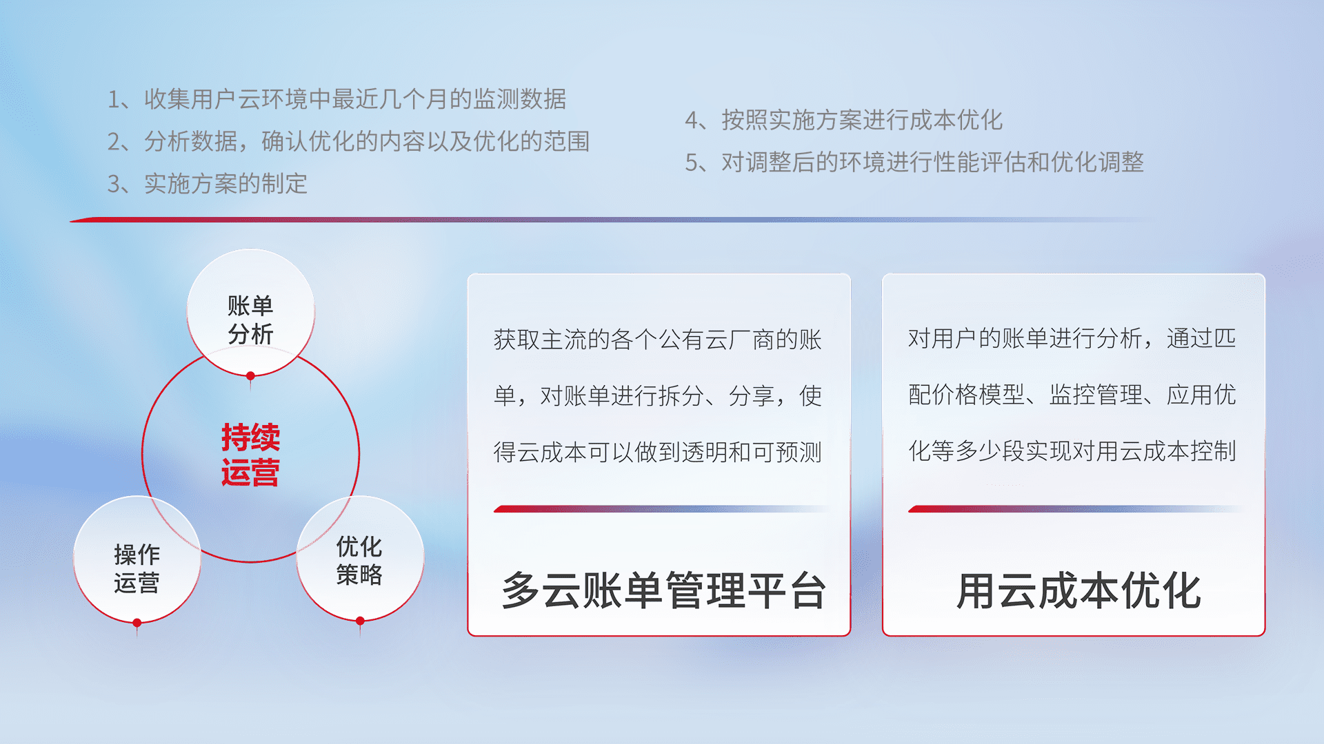 通过多云纳管,,,以统一的资源数据模型把客户的云资源进行抽象和封装,,,,进而实现对多云资源的统一操作,,,保障云资源管理的可靠性、、、稳定性与可用性。。量身定制化运维内容,,,配置、、、开发运维、、、、补丁管理、、备份、、、、监控、、、认证和访问管理、、、、审计和日常巡检等,,,保障在用云过程中的可靠度,,稳定度以及高可用率。。。。