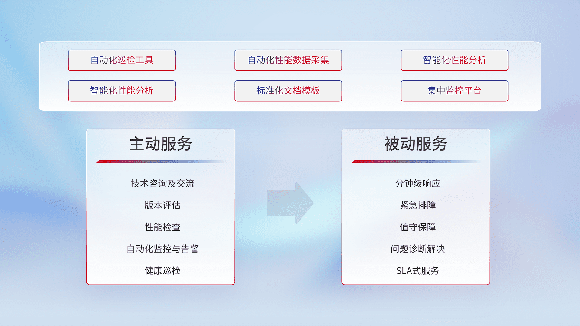 智能化工具和标准化文档,,,保障服务质量,,,,提供主动服务(包含技术咨询、、、、版本评估、、性能检查、、、自动化监控与告警、、、、健康巡检)和被动服务包含(分钟级响应、、、紧急排障、、、、值守保障、、、问题诊断解决、、、SLA服务)。。